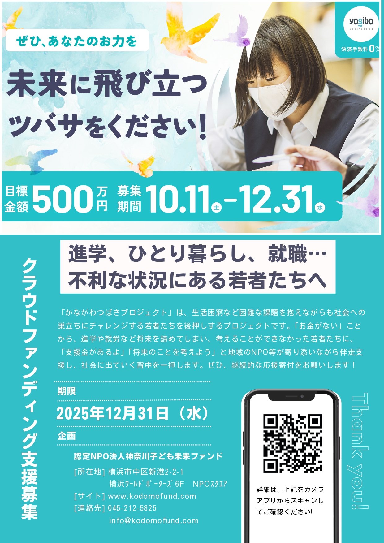 「かながわつばさプロジェクト」は、生活困窮など困難な課題を抱えながらも社会への巣立ちにチャレンジする若者たちを後押しするプロジェクトです。